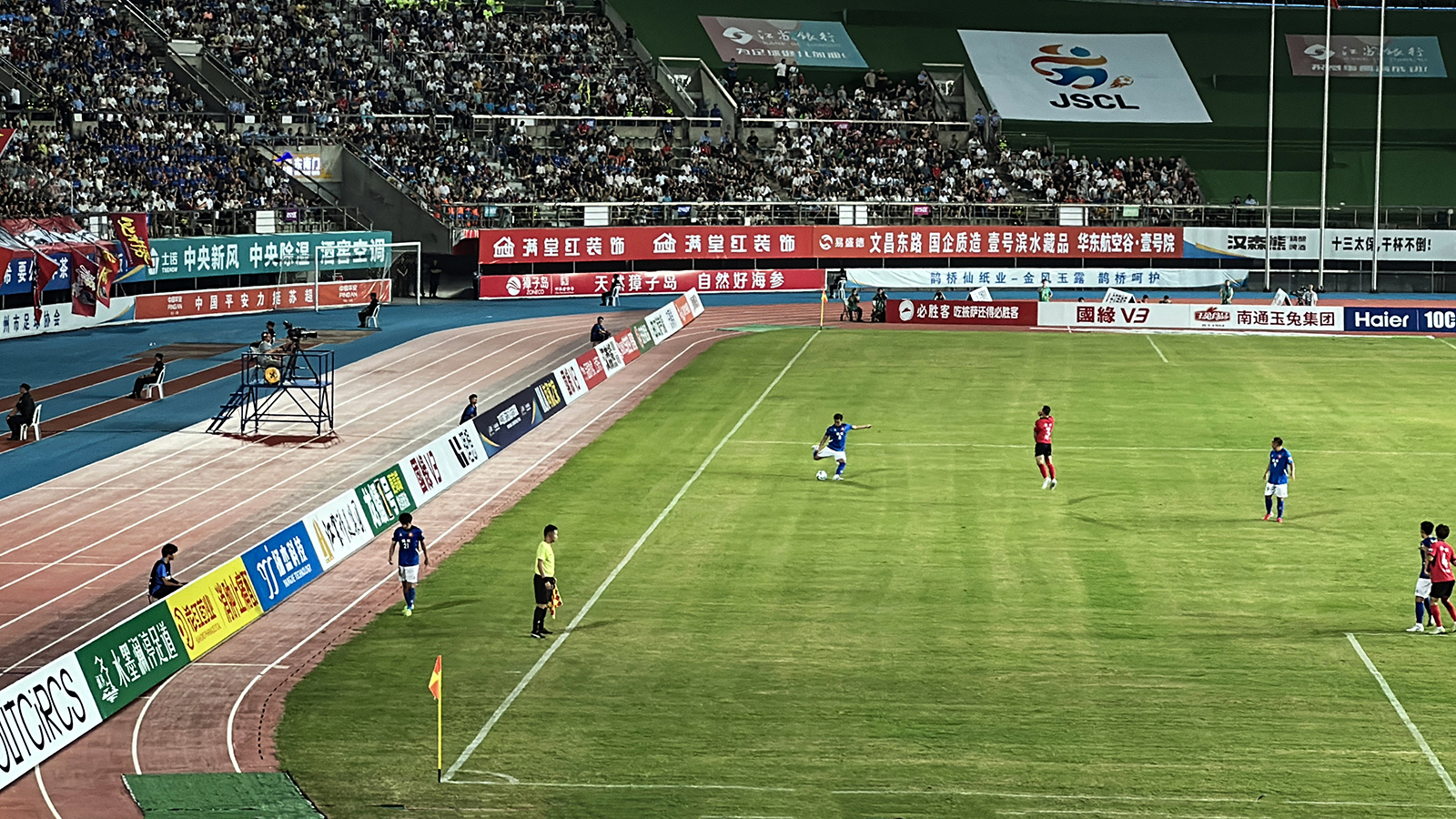 比賽開場即顯德比張力,雙方攻防節(jié)奏緊湊。上半場,揚(yáng)州隊(duì)借主場之勢主動進(jìn)攻,胡志鋒曾頭球制造威脅;淮安隊(duì)依托反擊施壓,均被雙方門將化解險情,半場 0:0 戰(zhàn)平。賽場周邊士諾品牌廣告牌與球迷助威聲交織,為比賽增添期待。
